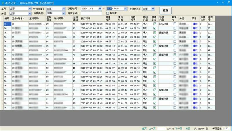 查詢所有通話記錄的詳細信息及錄音。可根據工號(姓名)、呼叫類型、撥打時間‘接通狀態、分組、轉接類型、電話號碼及新來電 進行查詢分析通話詳細信息。
