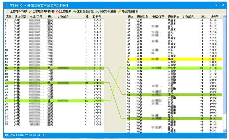 查看當前的所有電話的通話狀態,以不同顏色區分并把相互通話的線路用對應顏色的線鏈接起來。可以很直觀的看到每條線路的通話情況。同時 具有以下操作功能。