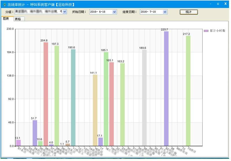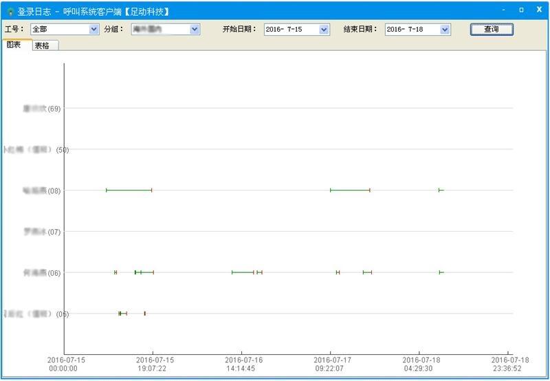 以圖表和表格的形式展現每個工號在指定時間段內的登坐席時間退坐席時間。