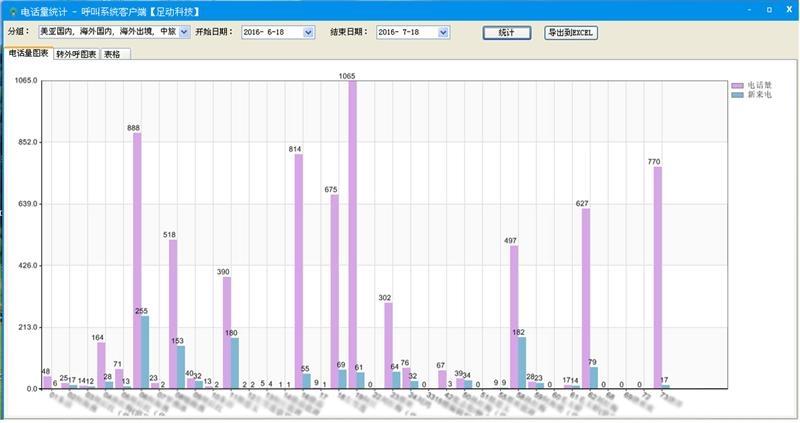 以圖表和表格的方式展現每個工號在指定時間段內的電話量、新來電數、轉外乎及轉外乎接通量。