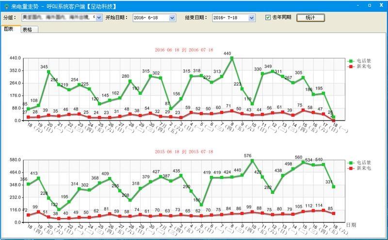 以圖表和表格的形式展現每個部門在指定時間段內的來電量及新來電量同時可以與去年同期進行對比。